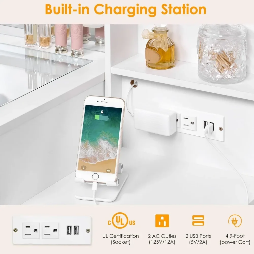 【BUILT-IN CHARGING STATION】 The white vanity with lighted mirror is equipped with a built-in charging station that includes 2 standard sockets and 2 USB ports for your convenience. This feature allows you to charge your phone, hair curler, hairdryer, and beauty devices while you create exquisite makeup and hairstyle designs at the vanity